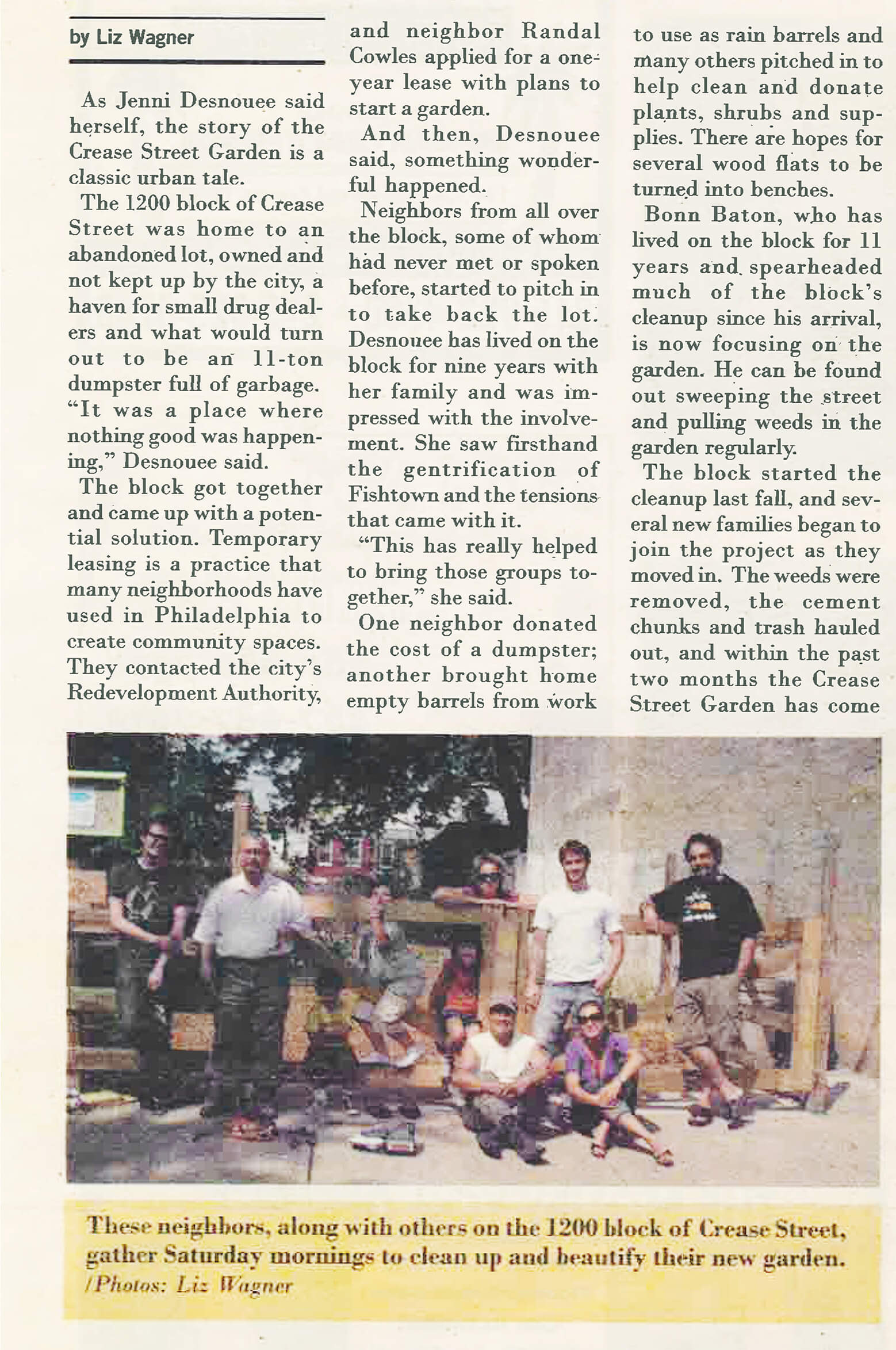 For most of the 19th and 20th centuries, the present location of the Crease Street Garden, 1236-38 Crease Street, was a very narrow alley known as ‘Deans Avenue’ which ran between Crease Street and Day Street. Old maps indicate fourteen houses stood in the area now occupied by the Garden, four typical row homes, and ten small, very shallow houses. In the mid-seventies the City took possession of and demolished all fourteen houses, the leaving the land vacant, simultaneously abolishing the alley.
