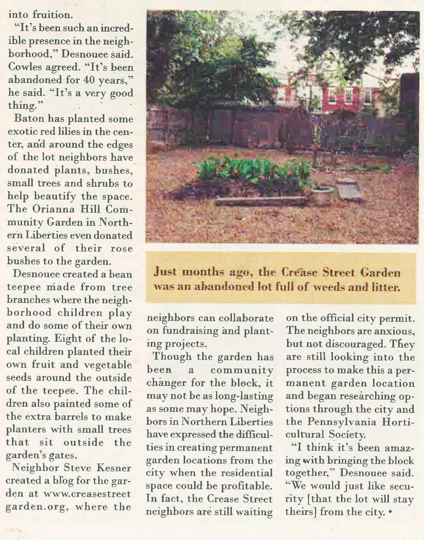 For approximately 40 years, from the mid-70s through 2009, 1236-38 Crease Street remained in the ownership of the City. Aside from vast quantities of brick associated with the now demolished houses, the lots were completely overgrown with saplings, bushes, weeds, and vines, and additionally served as a dumping ground for construction and household trash, abandoned vehicles (including one vehicle out of which a drug dealer served his customers), and other refuse.